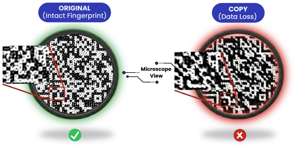 This demonstration shows how AuthNow distinguishes an original QR code from a high-quality copy using microscopic fingerprint analysis.